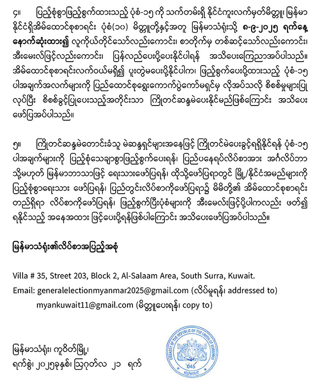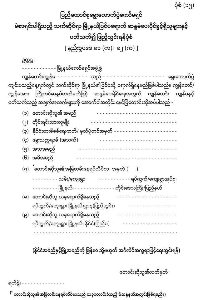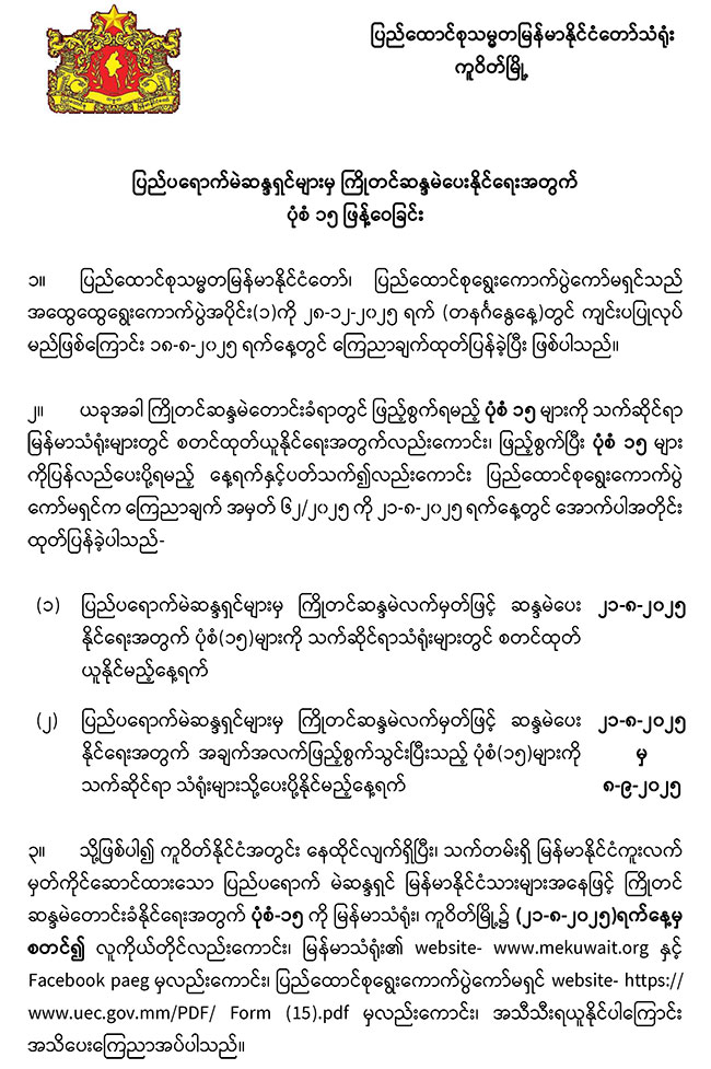 ပြည်ပရောက်မဲဆန္ဒရှင်များ ကြိုတင်ဆန္ဒမဲလက်မှတ်ဖြင့် ဆန္ဒမဲပေးနိုင်ရေးအတွက် ပုံစံ(၁၅) ဖြန့်ဝေခြင်း